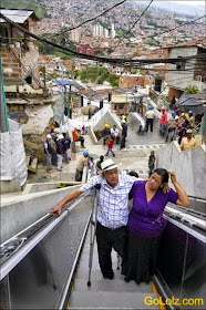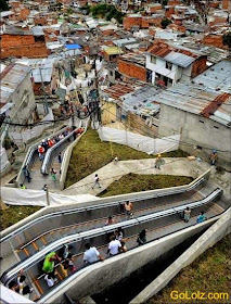 Beberapa gambar dari luar ruangan eskalator pertama di dunia di atas berada di Comuna 13 Medellin Kolombia yang dimasukkan ke dalam eskalator proyek outdoor yang telah diinstal di permukiman kumuh. Lebih dari 350 tangga beton telah digantikan oleh eskalator yang mengurangi 35 menit berjalan kaki menuruni lereng sampai enam menit dari rumah mereka.
