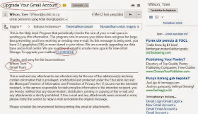 Emailspam dengan judul "Upgrade Your Gmail Account" seperti gambar (klik pada gambar untuk memperbesar) di atas, menurut LM dapat menjadi masalah besar ketimbang emailspam lainnya yang LM dapat selama ini, mungkin sobat yang menggunakan layanan email gratis gmail ini pernah mengalaminya. Kenapa LM sebut ini dapat menjadi masalah besar? Karena emaispam jenis ini tidak terdetesi sebagai spam (tidak masuk ke label spam) bahkan mendapat tanda sebagai email penting (lihat tanda kuning pada gambar yang di lingkar merah) oleh gmail. Karena rasa keingintahuan yang begitu besar, kemudian LM klik "CLIKHERE" dan kemudian dibawa ke halaman baru beralamat: